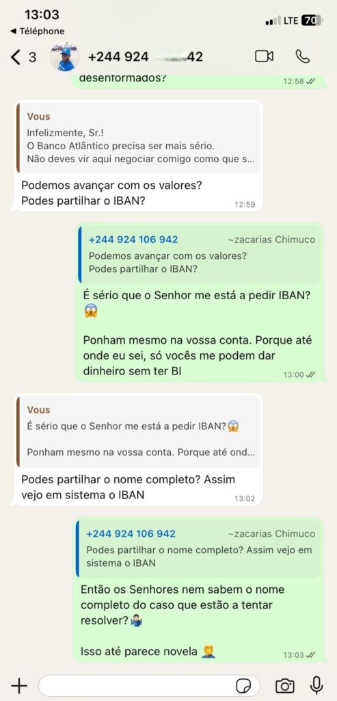 Segundo o denunciante, o processo teve início quando recebeu uma transferência do exterior e foi informado de que, por política interna, o levantamento exigia presença física para preenchimento de documentos e apresentação do BI. Após ser atendido, Gimi Panzo deixou o seu documento no banco, acreditando tratar-se de um procedimento normal, e ausentou-se, segundo contou a este Jornal.